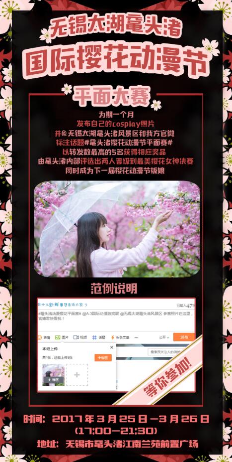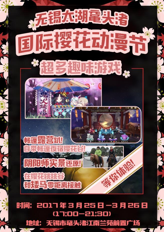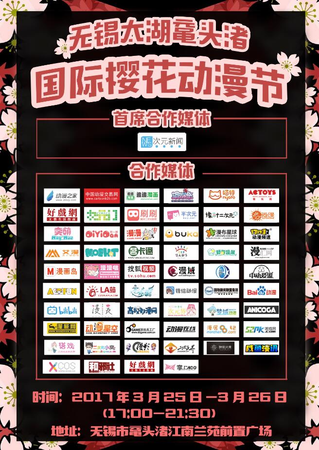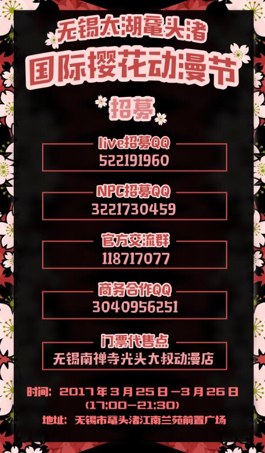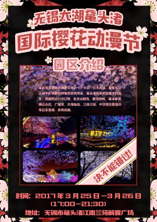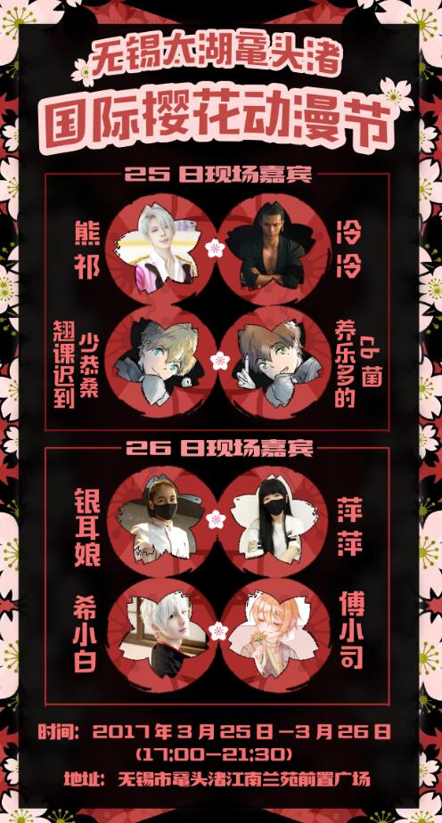 无锡太湖鼋头渚2017国际樱花动漫节即将于3月25-26日正式开始,露天夜场盛典,再度强势袭来!ACTOYS作为合作媒体为您抢先爆料!这次动漫节邀请到熊祁,冷冷,少恭,CB,银耳娘,萍萍,傅小司,希小白8位嘉宾助阵现场,快来体验一场樱花与二次元的超强碰撞吧~