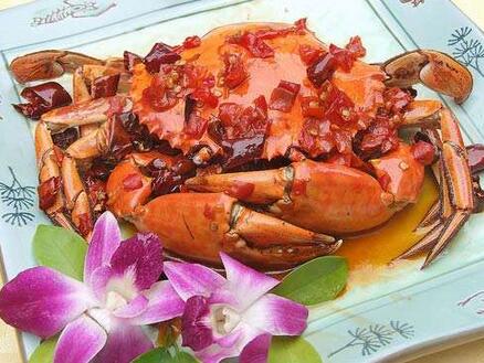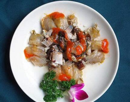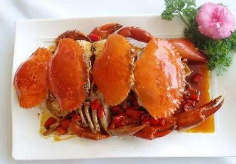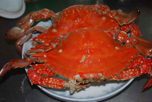 潮汕赤蟹 此蟹即潮汕膏蟹,学名叫锯缘青蟹,为广东潮汕的著名海产。膏蟹就是卵巢最丰满的雌蟹﹔已受精但卵巢不太饱满的雌蟹称“母”:略微饱满的叫“花蟹”﹔而雄蟹只供炒用,与未受精的母蟹统称“肉蟹”。捕自海中的雌蟹,卵巢饱满的不多,要进行人工育肥,使之成为“膏蟹”。养殖好的膏蟹,腿粗肉满,膏满脂丰,清蒸之后,鲜美异常,营养价值甚高。
