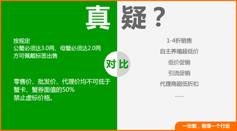 阳澄湖大闸蟹由于产量仅2000吨,仅占全省大闸蟹产量的500分之一,价格相对较其他产区高。且有相关规定零售原价或蟹卡礼券票面价不允许虚标太高。标价格超过实际销售价的1.5倍,则被视为价格虚标。