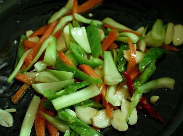干辣椒两个,姜丝适量,蒜末适量,调和油适量,红萝卜少量,白菜梗少量,青椒少许,料酒一小勺,老抽一小勺。