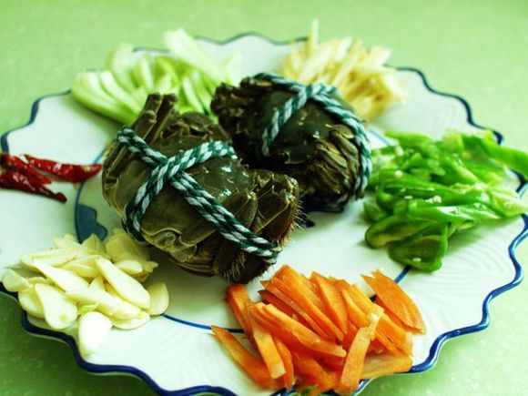 将大闸蟹的绳子松开并洗干净,然后切开将呼吸的腮去掉,将蟹切开备用;