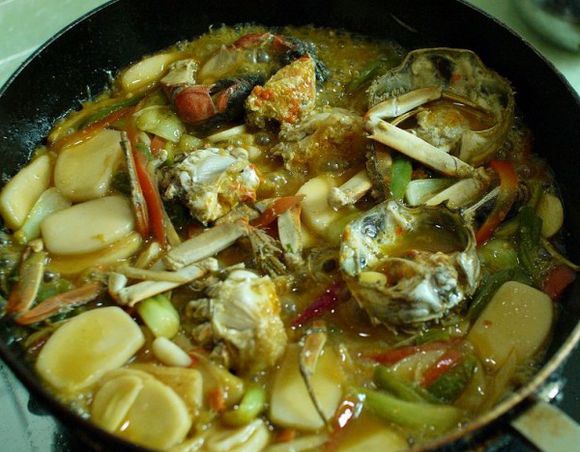 感觉大闸蟹完全变成橘黄色,并且年糕片已稍软之后,向锅里加入一汤勺水,目的是让年糕片、大闸蟹、配菜的香味相互融入进汤里。