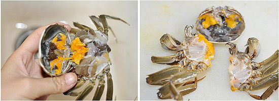 3.20分钟以后,蟹醉了,用手斜着握住蟹壳,用力一掰,蟹壳就打开了,去掉蟹腮,胃,肠