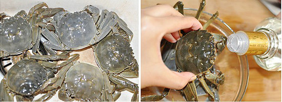 2.再把大闸蟹放在器皿中加入适量白酒,(可以将白酒淋入螃蟹的嘴里一些,醉的比较快哈)