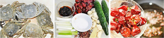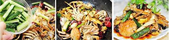 大闸蟹5只,黄瓜3根,葱姜蒜、花椒、生抽、白糖、香辣酱适量,一大把灯笼椒