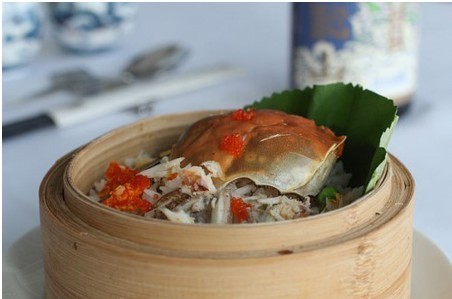 2.将螃蟹肉上加以调味料拌匀,腌入味,加糯米饭拌匀 ,放入盘内,上面撒叉烧肉粒,入笼用旺火蒸熟取出, 放小香葱颗即成,放入盘内,上面撒叉烧肉粒,入笼用旺火蒸熟取出, 放小香葱颗即成。