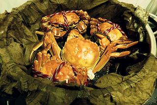 大闸蟹、干荷叶、葱段、姜丝、浙醋各适量。
