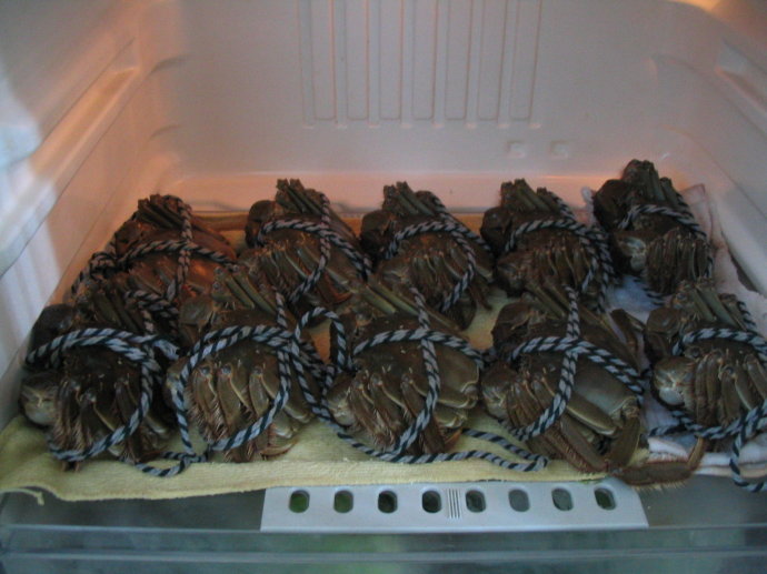 用冰箱来保存“阳澄湖大闸蟹”,如果所购大闸蟹数量不多,能在三天左右吃完的保存方法比较简单,选活力旺盛的大闸蟹,并把大闸蟹的脚捆起来,减少大闸蟹体力消耗,之后再放在冰箱的冷藏柜,温度保持5度-10度,并盖上湿毛巾保存。 区分大闸蟹活力足不足的方法是,用手点点大闸蟹的眼睛,反应不灵敏的就要先吃掉。