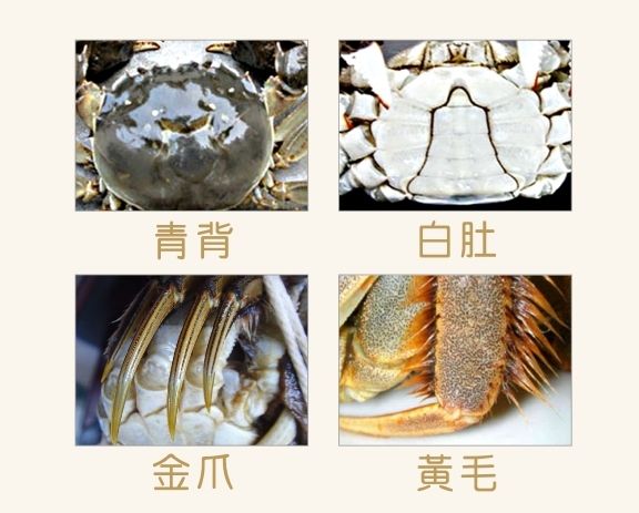阳澄湖大闸蟹从古时候开始就已以“青背、白肚、金爪、黄毛”闻名天下。久而久之, 也成了鉴定阳澄湖大闸蟹的一个标准之一。