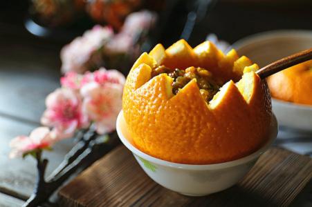 过程:选熟透且带有两片叶子的大橙子,把顶部切下去瓤,留下少许橙汁,把 大闸蟹的黄、肉塞入其中,再以切下的顶部封口放入蒸锅中,加酒、醋、水蒸熟。