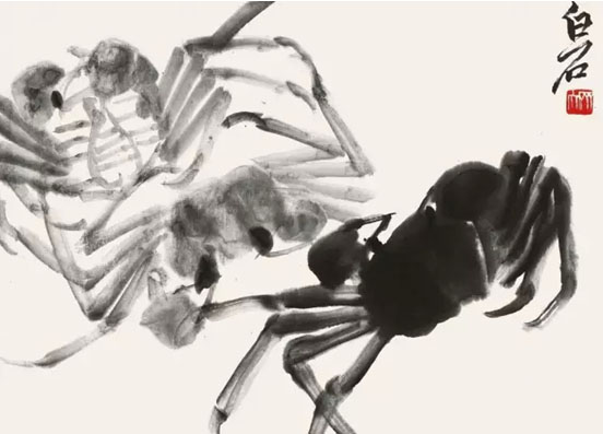 齐白石一生的创作中,最为后人赞赏的就是他画的蟹与虾,蟹壳、长足皆有质感,用水墨表现蟹足的细毛,堪称一绝。是故齐白石也自诩道“老来画法无来由,别有西风笔底秋”。笔下之虾造型各异,有笔有墨,虾须不直即倒,极富书法韵味,而动感、质感兼备,达到了神形俱佳的化境。