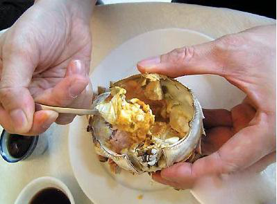 6然后用小勺把醋浇在蟹的身上,这时候就可以吃蟹黄蟹膏了。