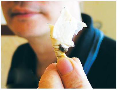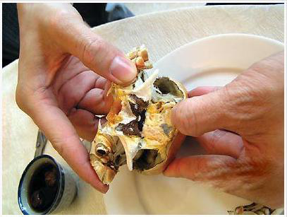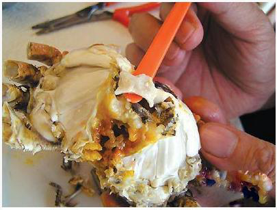 5一定要记住把蟹的心拿出来,因为那是极寒性的,不可以吃,六角形片状取蟹心。