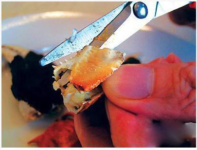 4吃完盖子之后就可以准备吃身上的肉了,首先将之前没有剪干净的螃蟹腿剪干净。