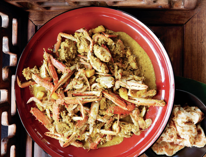 食材: 蓝蟹3只、花生油80毫升、红葱6只,切片、蒜瓣4个,切片、椰浆375毫升、椰肉适量、小菠萝半只,去皮切成小块、海盐1小勺、青柠半只 辣椒酱所需食材:辣椒粉1大勺;胡荽粉 2大勺;姜黄粉1小勺 香料酱所需食材:红葱8根,切碎;蒜瓣2个,切碎;棕色豆蔻籽3个;绿色豆蔻籽3个;八角茴香2个;肉桂条1小根;丁香2颗;罂粟籽1小勺