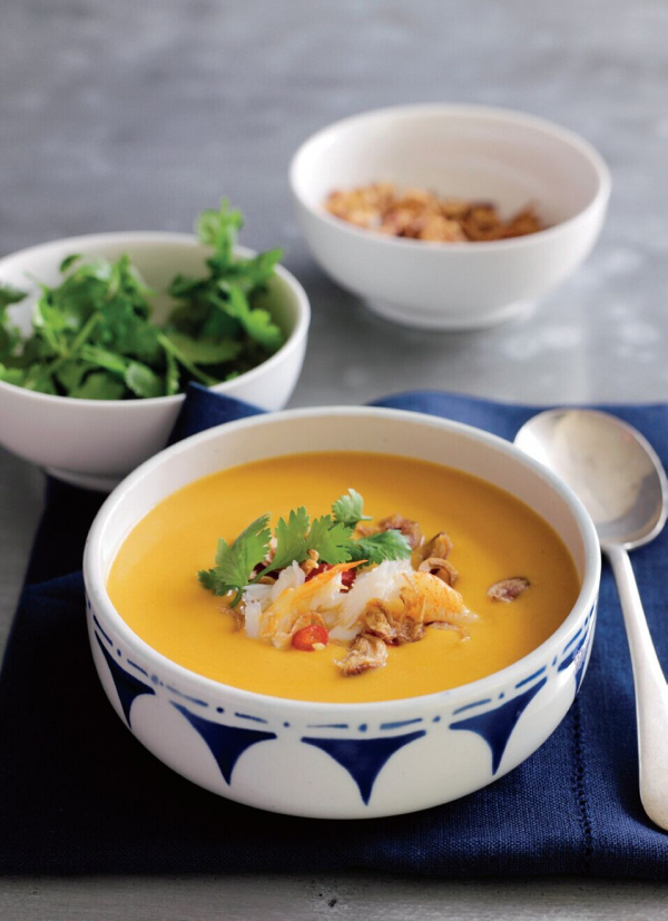 食材: 花生油2大勺、泰式红咖喱酱2大勺、磨碎的新鲜生姜2小勺、小葱3根,切碎、奶油南瓜800克,去皮切块、中等个头的成熟番茄2只,去皮去籽,切块、鸡汤(少盐)750毫升、椰浆270毫升、鱼露1-2小勺、青柠汁2大勺、做好的熟蟹肉1/2杯、新鲜红辣椒2只,切片、嫩胡荽叶1/4杯、炒洋葱片2大勺(现成品超市买得到)