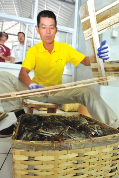 开捕首日一早,记者乘快艇来到太湖水域中心,在华记水产品合作社养殖基地,乘坐小船的工人们正忙着把网中的蟹往桶里装,“今年质量不错,你看这一桶里就好几只四两半以上的公蟹了。”蟹农说。随后,记者跟随新鲜出水的大闸蟹来到岸边的太湖蟹出口加工区,100公斤高品质大闸蟹经过出入境检验检疫部门人员检查后,被迅速分装、打包、贴上可进行质量追溯系统的二维码,整装待发香港。合作社社长华明志介绍,这是合作社今年出口第一单:“去年总产量约53万斤,出口了83吨。今年估计要出口100吨以上。”