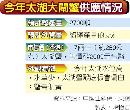 按照往例,大闸蟹以產自阳澄湖的身价最高贵,今年太湖大闸蟹身价跟着疯涨。相较之下,兴化大闸蟹、固城湖大闸蟹价格相对稳定,吸引不少想尝鲜的民眾提前购买。