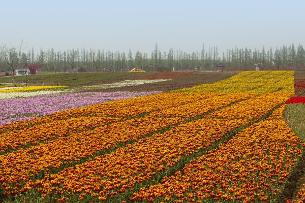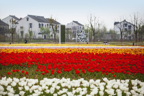 一片绚烂如彩虹的郁金香花海,柳舍东头的大片地景田园中,来自荷兰的104种郁金香球根,吸吮着肥沃黑土中的营养,开得五光十色恣意酣畅。