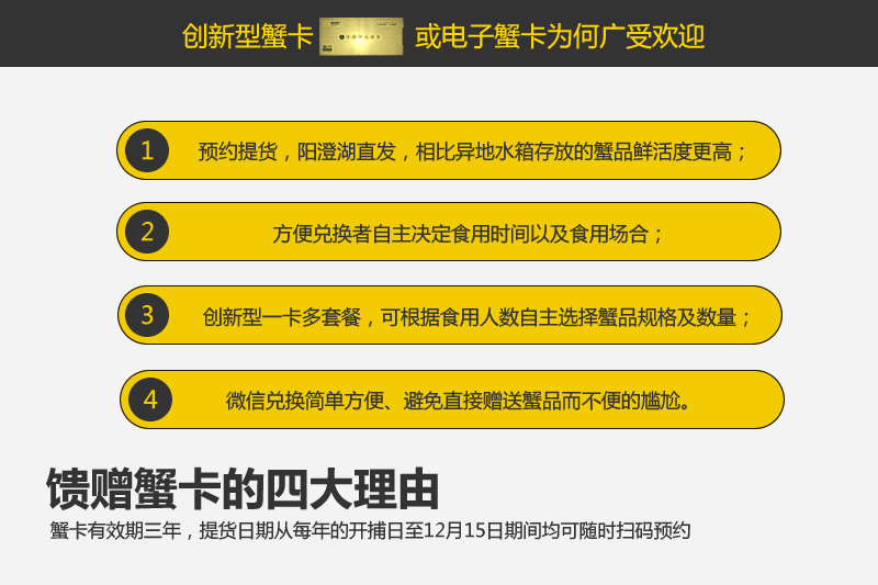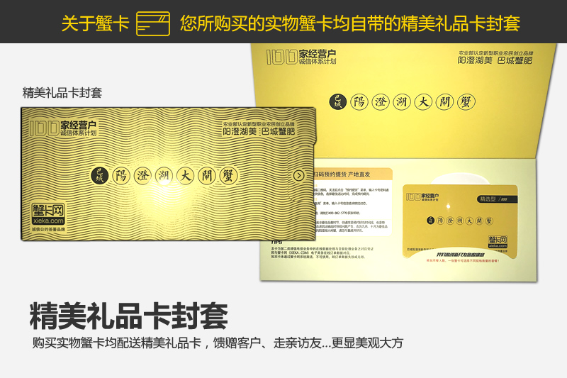 您选择了 实物蟹卡 购买后将收到为您寄送的含精美包装的大闸蟹实物礼品卡