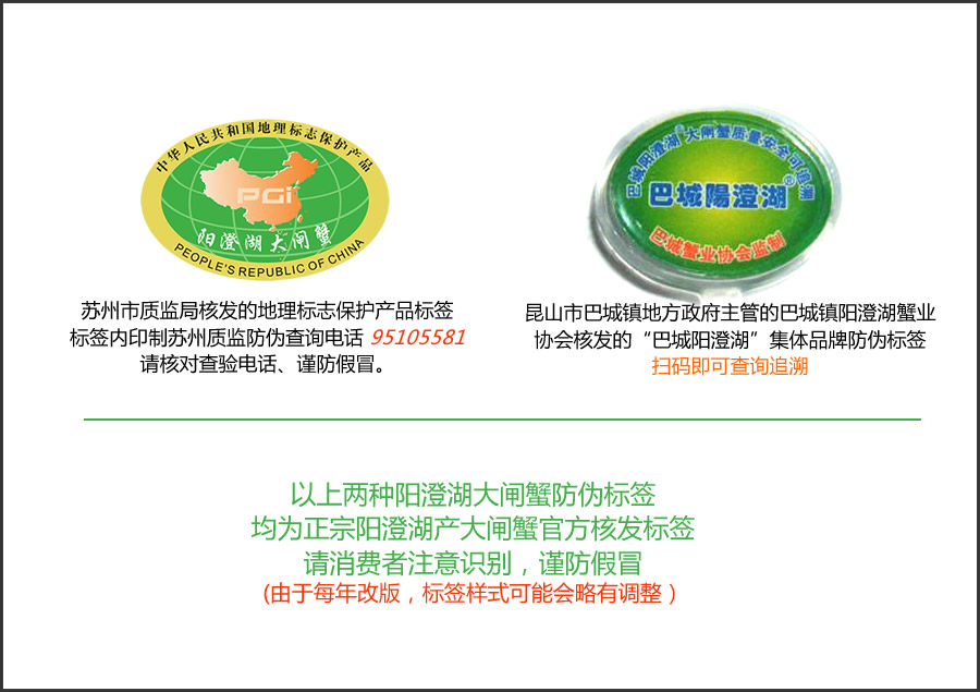 产地标准认定依据:依据苏州市阳澄湖大闸蟹行业协会、昆山市巴城镇阳澄湖蟹业协会对经营者的认定,确保阳澄湖产大闸蟹的产地。同时,蟹卡网管理公司对经营户的围网证、围网租赁证等相关资料进行核实。以确保蟹品产地。经营户必须逐只配戴由苏州市质监局核发的地理标志保护产品标签或昆山市巴城镇地方政府主管的巴城镇阳澄湖蟹业协会核发的“巴城阳澄湖”集体品牌防伪标签。以上两种标签均为阳澄湖产大闸蟹的官方核准标签。